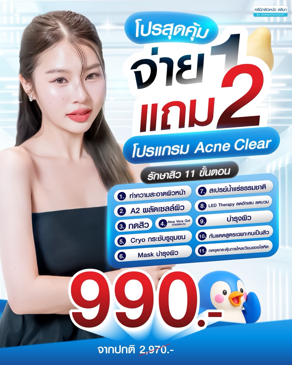 คอร์สรักษาสิว ราคา 990 บาท จาก 1200 บาท ด้วยโปรแกรม Acne Clear ที่คลินิกผิวหนัง ลลิษา โปรแกรม Acne Clear 11 ขั้นตอน ที่ออกแบบมาเพื่อจัดการทุกปัญหาสิว